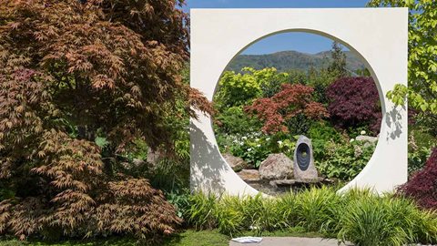 At One With… A Meditation Garden is a quiet retreat within a larger garden designed for meditation, yoga or simply a place to relax. The meditation area is a sunken circular area wrapped with planting by the side of a large pool. The silence is broken by three spring outlets, representing Malvern spring water, creating tranquil sounds against the backdrop of the hills. A mixture of lush grasses, specimen trees, Japanese maples and swaths of perennials complete the planting, which is harmonious in colour, texture and form.