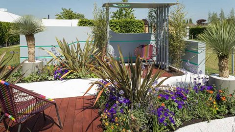 Inspired by Miami’s bold Art Deco architecture with its definite lines and generous curves, this is a spa garden for today inspired by the past. The garden contains dominant hard landscaping, tram lines of water and two pools of water. To counteract the landscaping is robust planting scheme, containing blocks of colour as well as plants selected for their architectural and feathery foliage as well as upright flowering habits. Many scented varieties are included.