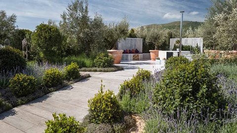The Retreat is built for a retired couple within the grounds of their holiday home in France. It is an inviting space, designed to offer a spa experience promoting health, calm and relaxation. The circular space is home to a hot salt water spa, heated by a wood-burner offering hydrotherapy. There are refreshing cold showers, a lounging area cooled by mist and an area for preparing refreshing healthy juice drinks and herb-flavoured water. The ‘spa room’ is surrounded by a timber wall as well as olive and bay trees underplanted with aromatics, including those commonly used in aromatherapy, such as lavender, sage and rosemary.