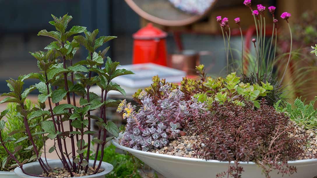 The design encompasses relaxed seating and dining areas, surrounded by plants at different levels to create the effect of being within a larger garden. The balcony’s outside walls act as spaces for ‘living’ pictures and shelves for plants. The planting focuses on easy-to-maintain sempervivums, succulents, grasses and culinary plants, providing year-round interest.