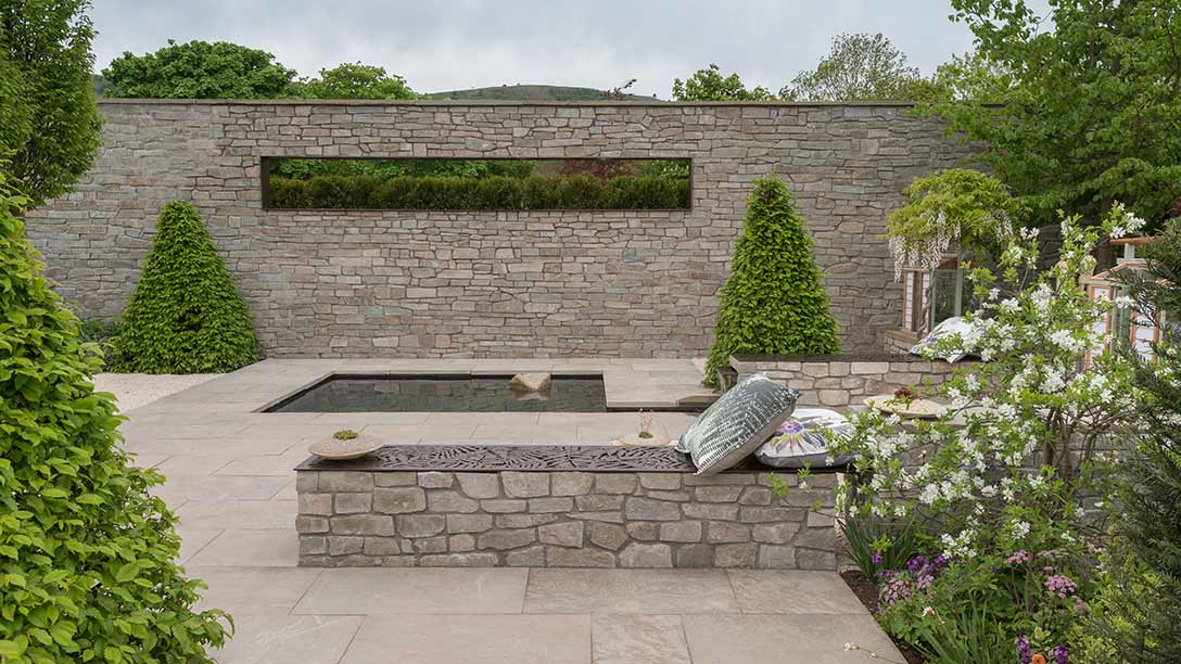 - The dominant stone wall at the back of the space frames the pool and provides a textural contrast to the plants, but the open window allows a borrowed view to the Malvern Hills beyond