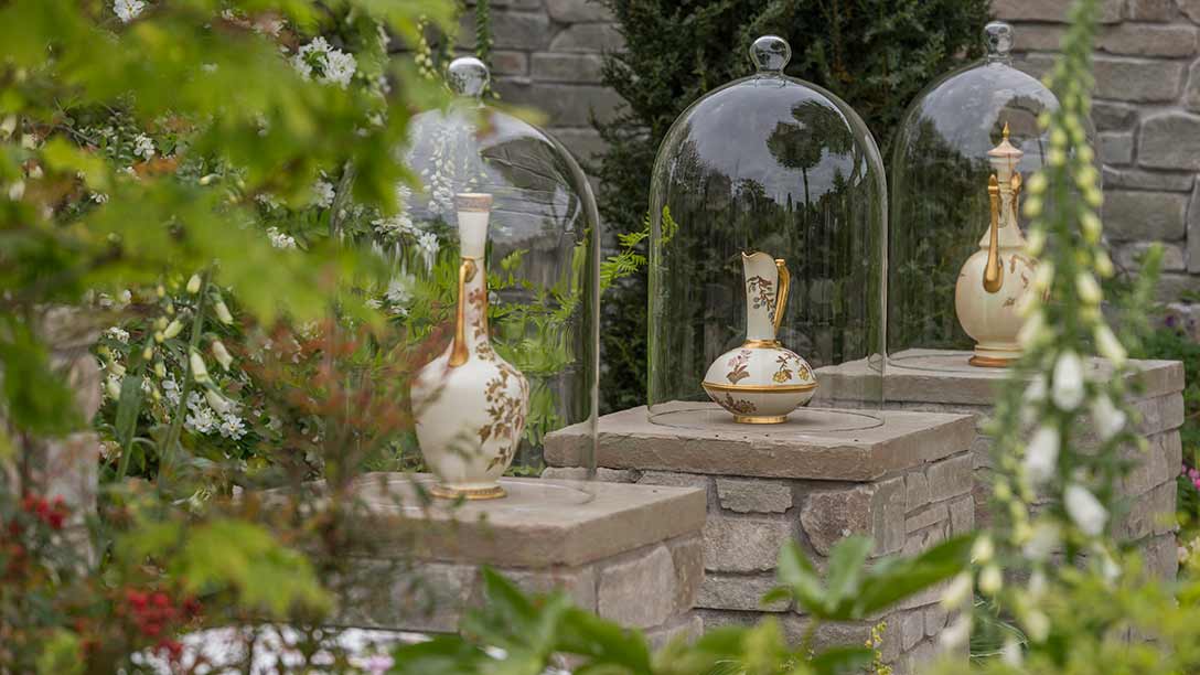 Five stone ‘exhibition’ plinths are arranged through the garden. Two carry bespoke terrariums based on the Wardian Case, and three house historic porcelain pieces beneath glass bell jars, surrounded by flowers and foliage including plants that inspired the artists who hand painted the Royal Worcester pieces.