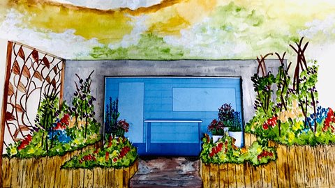 Two large raised borders made from recycled timber contain colourful flowers and foliage to be used for flower arranging. Climbing plants grow up rustic obelisks and a windbreak made from re-purposed gardening and agricultural tools. The look and feel is relaxed and informal.