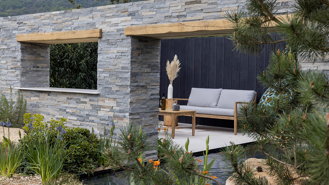 A water feature provides the link from the naturalistic front of the garden to the contemporary natural seating area. Evergreen and soft serene planting create a relaxing and contemplative feeling.