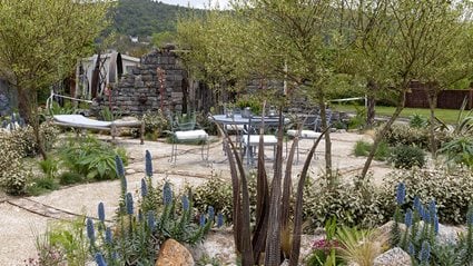 A watercourse meanders through the plot towards a central pond and a section of bog planting. A pavilion, designed in conjunction with designer and TV presenter Charlie Luxton, is topped with a living roof to provide a calm space to enjoy the diverse species living in the garden’s varied habitats.