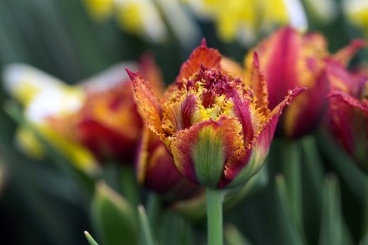 Two unusual new spring bulbs brought life to the H W Hyde stand: a double, fringed tulip in shades of orange named Tulipa ‘Bastia’, and a new, tiny yellow daffodil with the most unusual, rolled, rush-like foliage, Narcissus ‘More and More’.