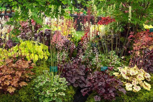 Shown by specialists Plantagogo, Heuchera ‘Thomas’, in the Fox series of cultivars, has prettily-marked green leaves forming a rosette, and is most notable for the length of its flower stems, around 45cm (18in) tall and ramrod-straight, giving the plant a much more substantial appearance.