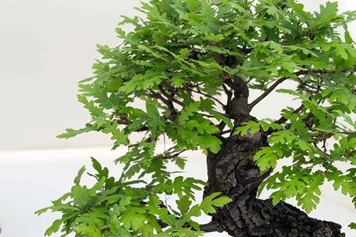Oaks are among the most difficult subjects to train as convincing bonsai as they seem to resent life as permanent pot plants and lack vigour, but Derbyshire Bonsai had a beautiful example of an evergreen species, Quercus cerris (Turkey or Austrian oak) in informal upright style, with typically-lobed leaves, and excellent, deeply-fissured bark.