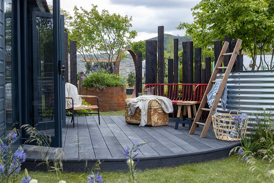 Wooden elements in the garden have been painted a smart dark blue colour. While this is the perfect foil for colourful planting such as zingy orange geums and zesty lime-green euphorbias, it has a serious message too. “It’s to remind us that we all have darkness in our lives, but there’s still light,” says Alan.
