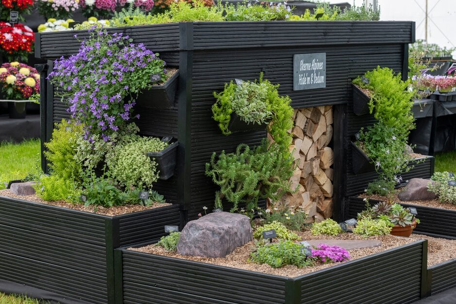 Skerne Alpines Nursery has created a display that shows how alpines are not just for rockery gardens. A wood log store with a green roof filled with sedums and sempervivums and walls housing planting pockets, makes sure that there is planting on every plane. Alpines really do adapt to living roofs and walls, they are low-maintainence and they don’t need a lot of water.”