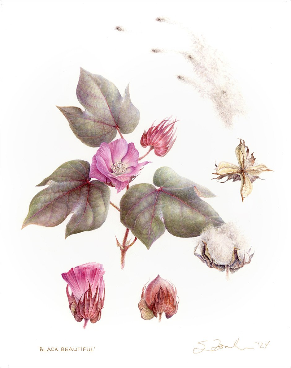 Susan Tomlinson is an Associate Professor in the Honors College at Texas Tech University. Her work is in the Hunt Institute for Botanical Documentation, and in 2022 she was awarded an RHS Silver-gilt for her cotton boll series. She is currently working on a book under contract for botanical paintings featuring cotton.