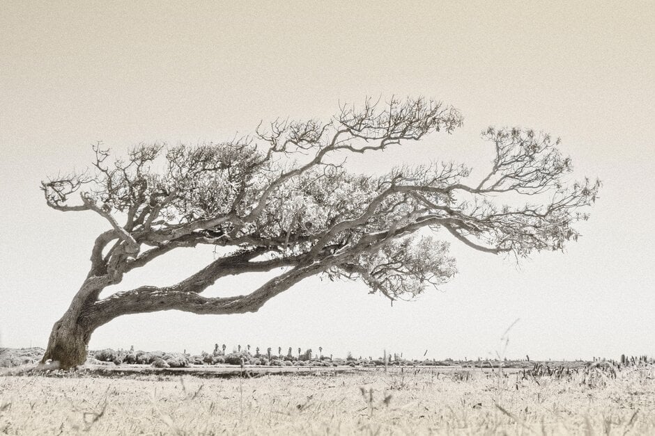 South African-born photographer Fran, while documenting the Cape Floral Kingdom, was drawn to the alien Acacia Cyclops trees, destined for removal to protect the region’s flora. She sought an ant’s-eye view to capture their twisted trunks, isolated against the sky, evoking the delicate beauty of Japanese paintings.