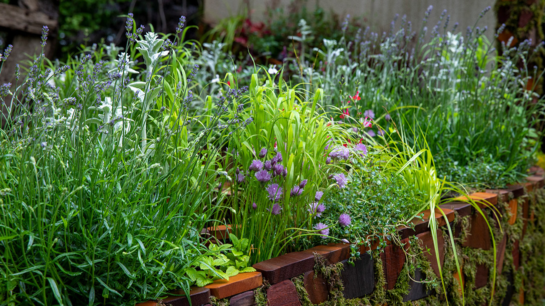 The planting incorporates herbs, wild grasses and vegetables, many with a practical application. Each plant colour represents the human emotions with green for healing, red for passion, yellow for warmth, white for purity and black for everyday troubles and worries.