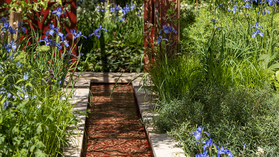 This garden of the Morris & Co. reimagines two of Morris’s iconic patterns. Morris’s first pattern Trellis (1862) inspires the garden layout and pathways and one of his most famous patterns Willow Boughs (1887) is reflected in the design of the pavilion and water channels. The pavilion incorporates patterned posts and intricate metal screens and the garden brings his continuing legacy to a contemporary audience.