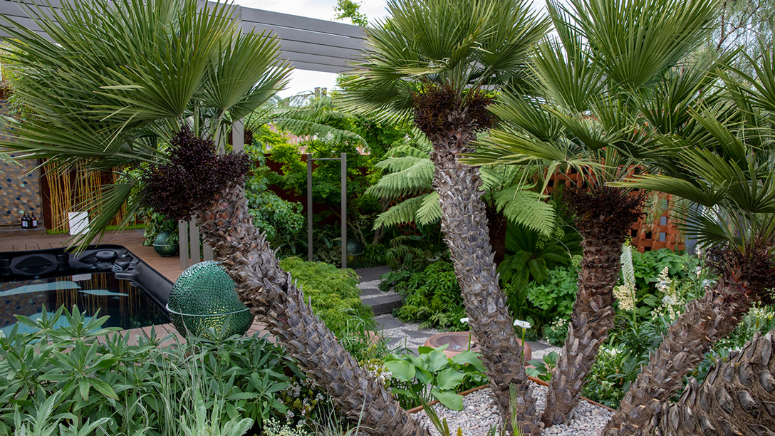 The planting has a strong evergreen backbone and a tropical theme. The interesting leaf forms offer a robust and resilient choice and illustrate that a predominantly green planting palette can be uplifting all year round.