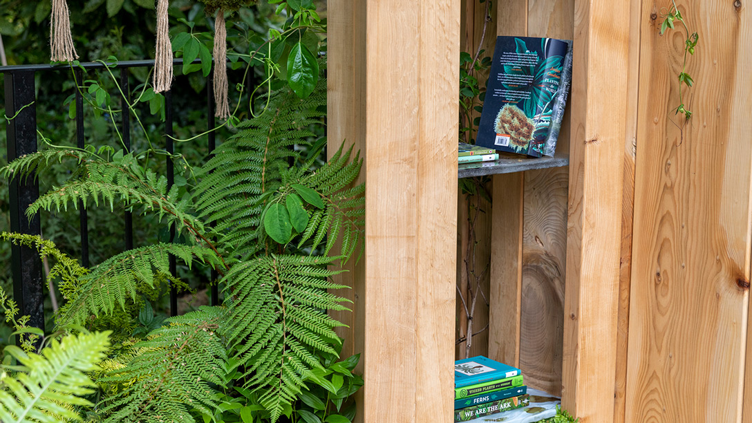 Timbers from a single cedar of Lebanon enclose the space, part of the practical inspiration offered by the garden on helping rainforest conservation by choosing locally grown timbers for outdoor use. In this calm green nook a child or adult can be immersed in plants and lost in books.