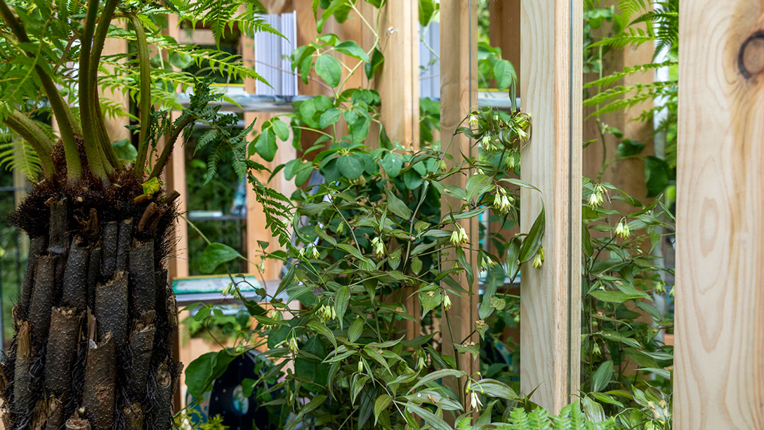 A rainforest story lies on a cosy window seat in an elegant outdoor room. Delicate, textural plants reminiscent of temperate and tropical rainforests illustrate the power of books to transport you anywhere in the world. As dusk falls, gentle lighting illuminates the scene, highlighting books, maps and translucent glass shelves.