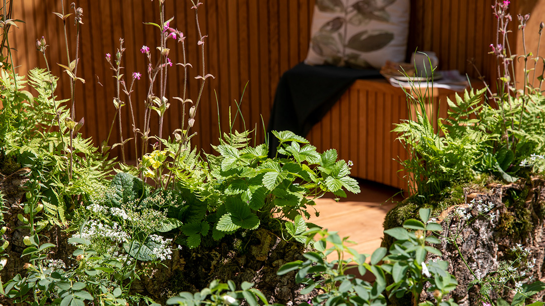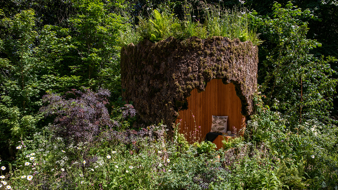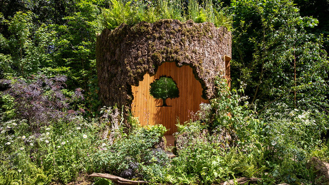 This oak home sanctuary, with charming duckboards leading in and out, is surrounded by layered European woodland with its serene and limited colours. It is also a chic teleworking oasis with a water feature window on the back wall. An innovative oak silhouette window on the front provides natural light, a view out and in, to the water feature. After the show, the Connected, by EXANTE garden will be relocated in its entirety at the University College London Hospital.