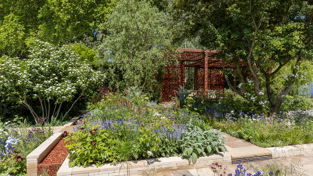 This garden of the Morris & Co. reimagines two of Morris’s iconic patterns. Morris’s first pattern Trellis (1862) inspires the garden layout and pathways and one of his most famous patterns Willow Boughs (1887) is reflected in the design of the pavilion and water channels. The pavilion incorporates patterned posts and intricate metal screens and the garden brings his continuing legacy to a contemporary audience.
