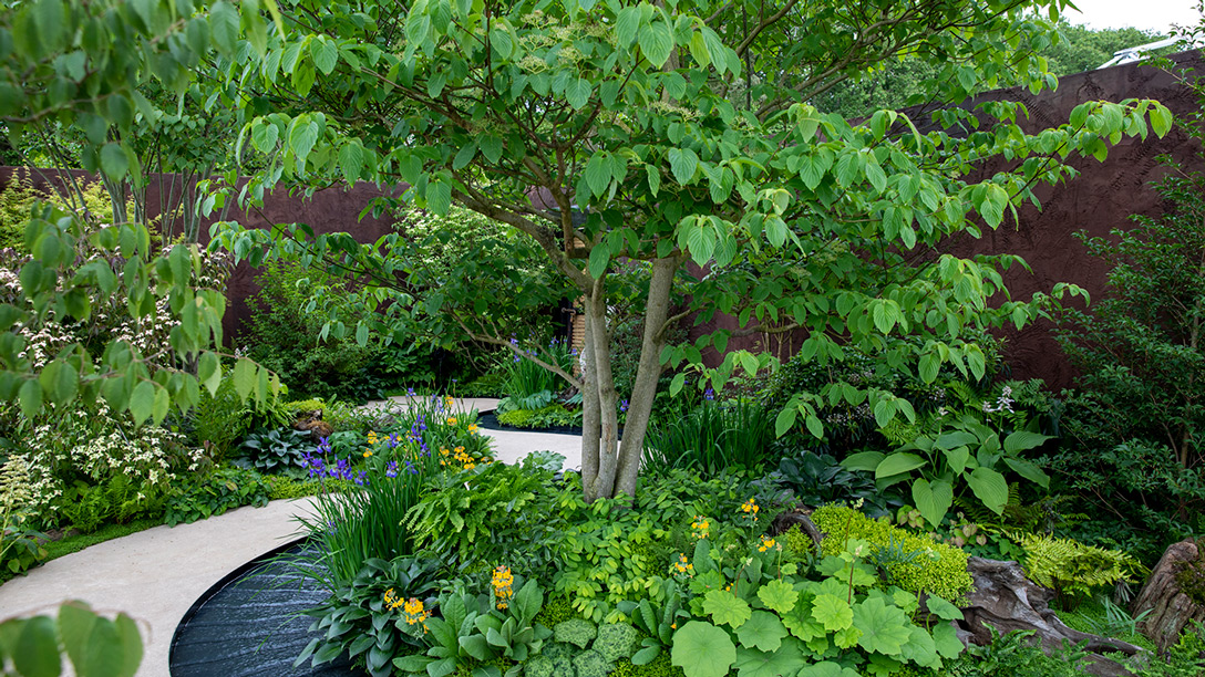 Planting with interesting form and habit has been chosen and includes potted Cyathea cooperii, native to India with stunning bark pattern, Cornus controversa from East Asia, with horizontal habit and Acer davidii from China with its striped white bark. Below the structural planting is a woodland stumpery-style underplanting with a trail of blue and burnt orange indicating a journey and creating movement in the planting. The mounded beds partially obscure views creating a sense of discovery.