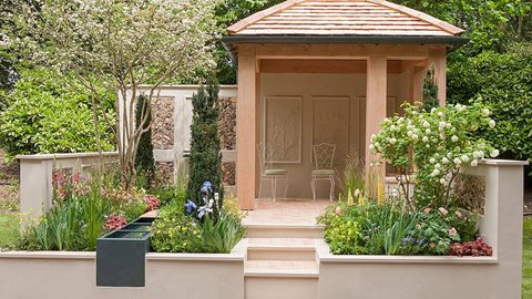 Inspired by the formality of Arts and Crafts gardens, A Suffolk Retreat offers a secluded space with a small summerhouse where young people with special educational needs, such as autism, can engage with music. Garden elements are inspired by local artisan crafts: pargetting, handmade bricks, flint and metalwork. The pastel planting palette both calms and stimulates.