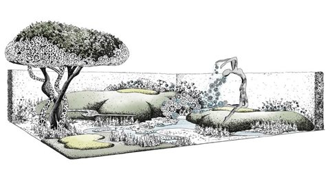 Central to the garden is the symbolic theme of lace, which weaves its way through to bring a unifying harmony to the two sides of the garden. The two key focal points in the garden are the striking metal lace and an arching bronze figurative water feature 'River of Time', both made by Ukrainian sculptor Victoria Chichinadze.