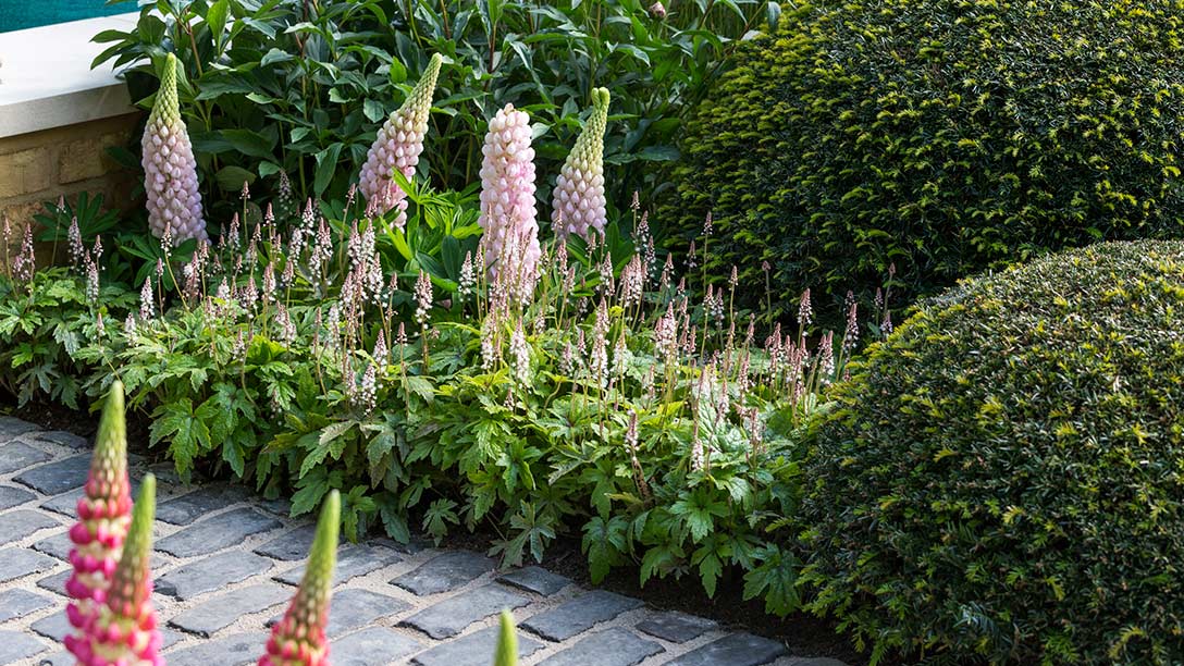 The history of Covent Garden from its origins as an apple orchard to the busy shopping destination it is today is illustrated with a mix of formal and informal traditional plants in pink and white.