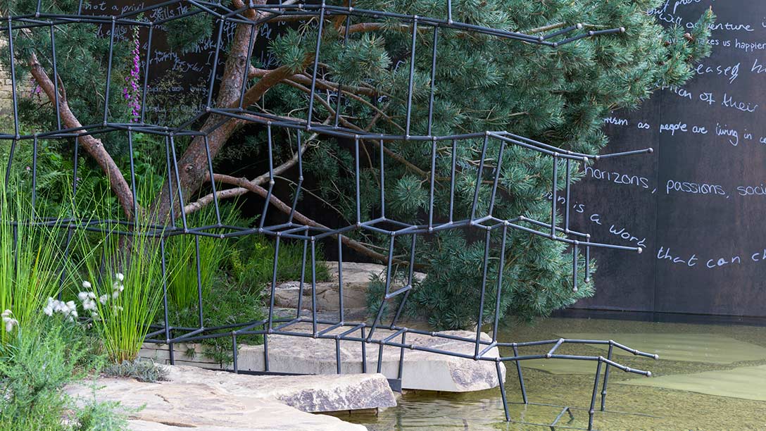 An elegant depiction of the learning and thought process in education using metal, open frameworks to represent the overcoming of barriers to learning. A colourful meadow area contains waves of purple salvias to reflect lateral thinking while umbels signify sudden thoughts and ideas