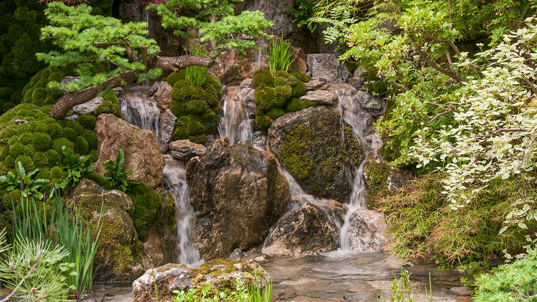 Immaculate Japanese water garden with waterfall and beautiful pool planted with a multitude of acers and bonsai conifers created with moss encrusted rockwork
