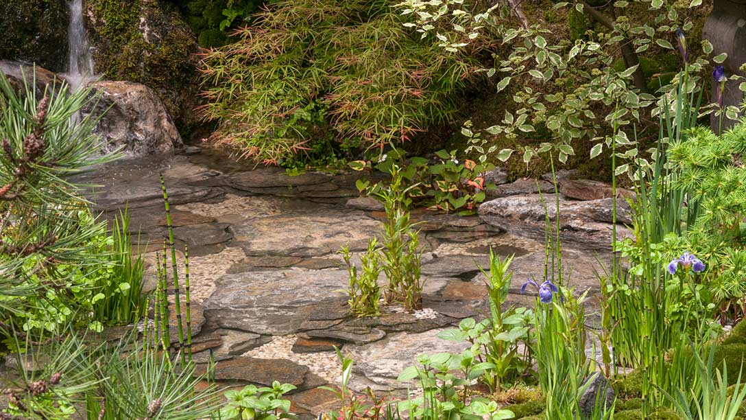 - Flowering Enkianthus growing beside pool along with miniature flowering irises helping to inject floral colour