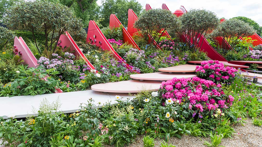 A garden of contrasts, with colourful sloping beds of rhododendrons and peonies on one side and foliage, shrubs and grasses on the other intersected by a spine of red blades representing the mountainous landscape of the Sichuan Province
