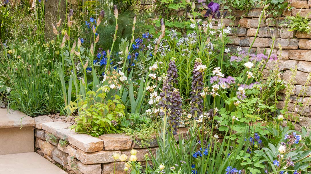Planting in the terraced bed are soft and traditional but included some unusual plants such as Amsonia, Thallictrum, white-flowered Libertia and the dusky bells of Fritillaria persica.