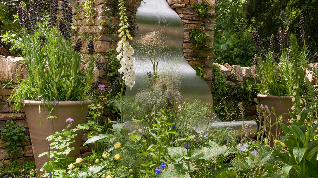 An undulating stainless steel water fountain is a focal point of this garden and is set into a dry stone wall, traditional materials blending with modern and softened by romantic planting.