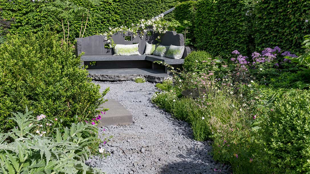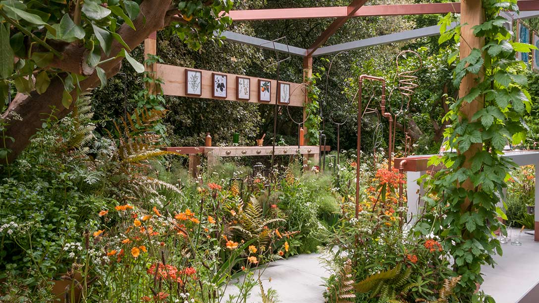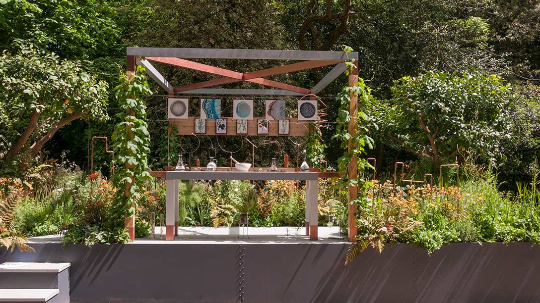 This conceptual garden is inspired by the story of Seedlip, its 17th-century apothecary origins and modern-day pioneering approach to distillation.Set in symbolic oak housing with copper detailing, ‘old meets new’ laboratory-style benches showcase these respective eras. A central abstract copper sculpture depicts the 350-year-old journey from book to bottle that inspired Seedlip’s founder to develop the world’s first distilled non-alcoholic spirits in his kitchen in the woods. Copper pipework and channels carry water through the garden, in tribute to their importance in the process of distillation.