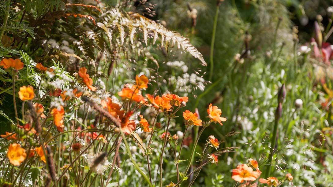 - Use of plants with a limited colour palette enhance the extensive use of copper including orange flowered geums, euphorbia and iris, along with the bronzy coloured ferns