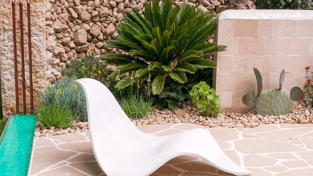- Contemporary lounger stands on a terrace paving which echoes the mosaic tiled wall