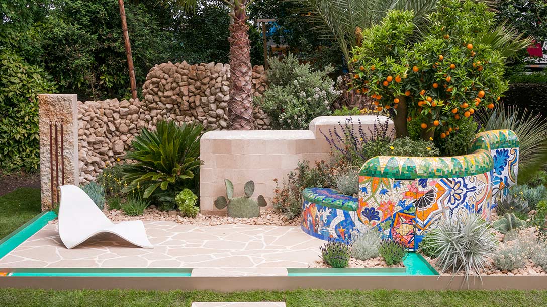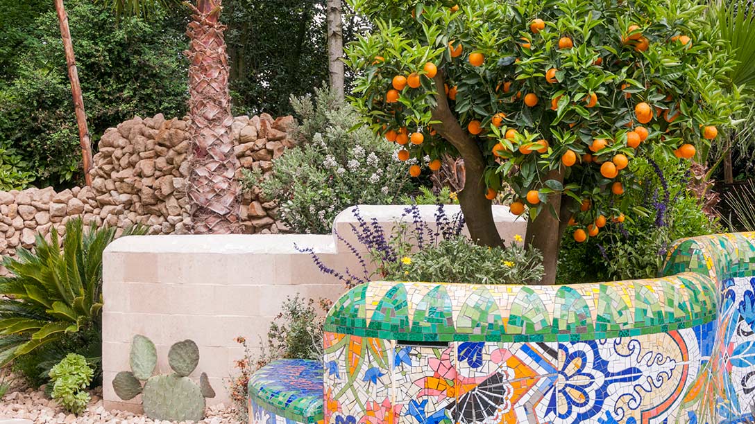 A garden redolent of the Mediterranean; succulents, lofty palms, and a fruiting orange tree combine with a mosaic covered wall inspired by Gaudi and his distinctive style