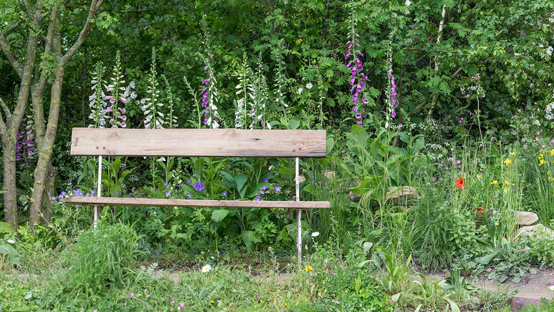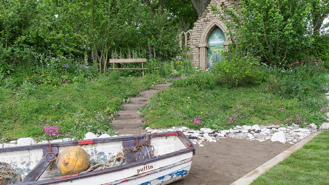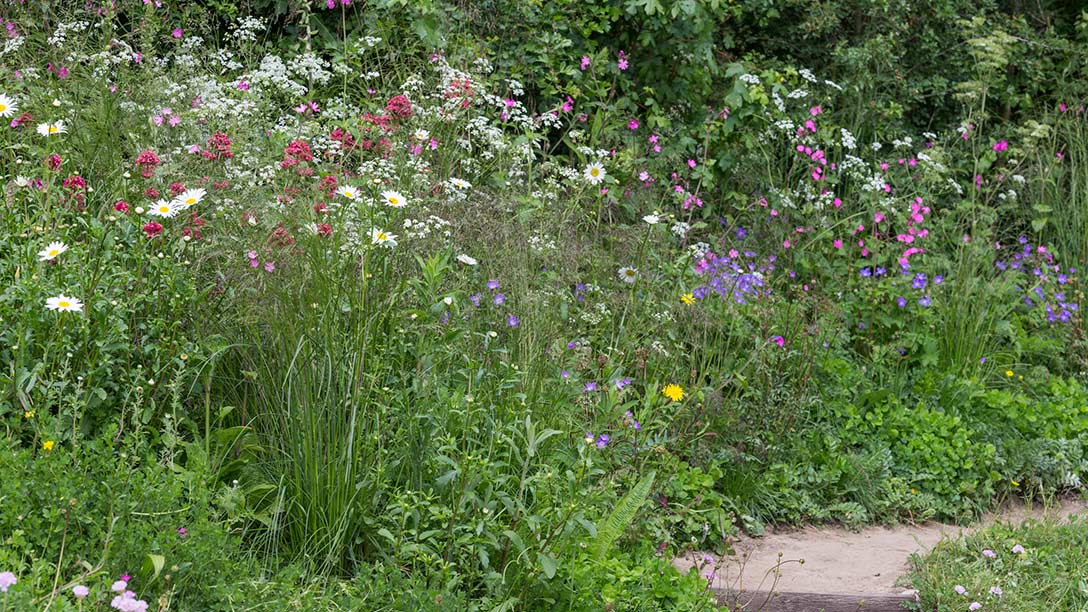 Woodland planting including dog rose, cow parsley and foxgloves, sits under a field maple and the flora becomes more coastal as it nears the beach