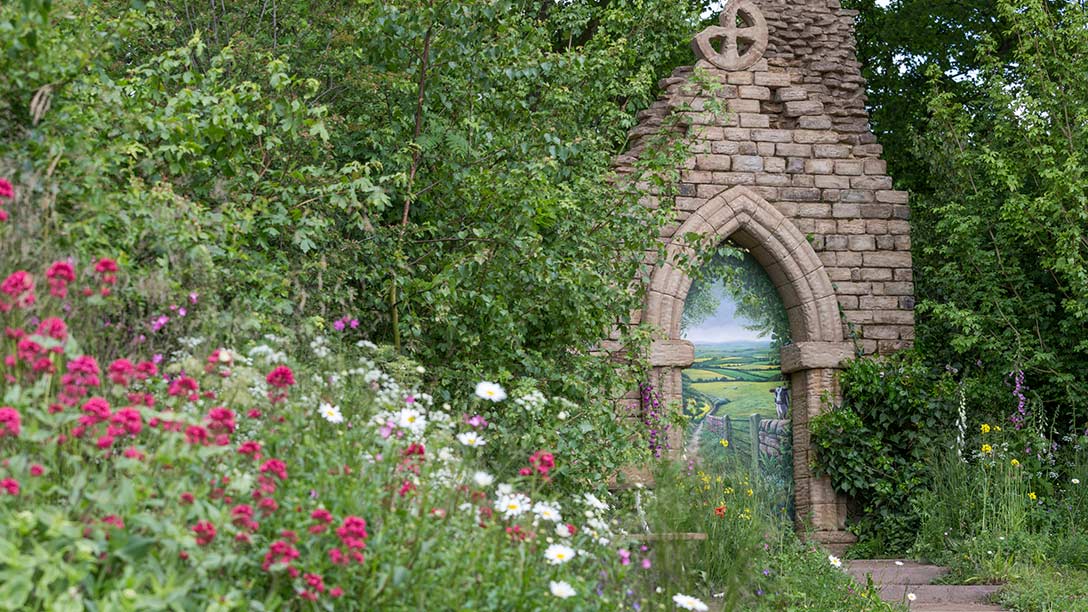 Multi stemmed Acer campestre (field maple) frames the ruined folly