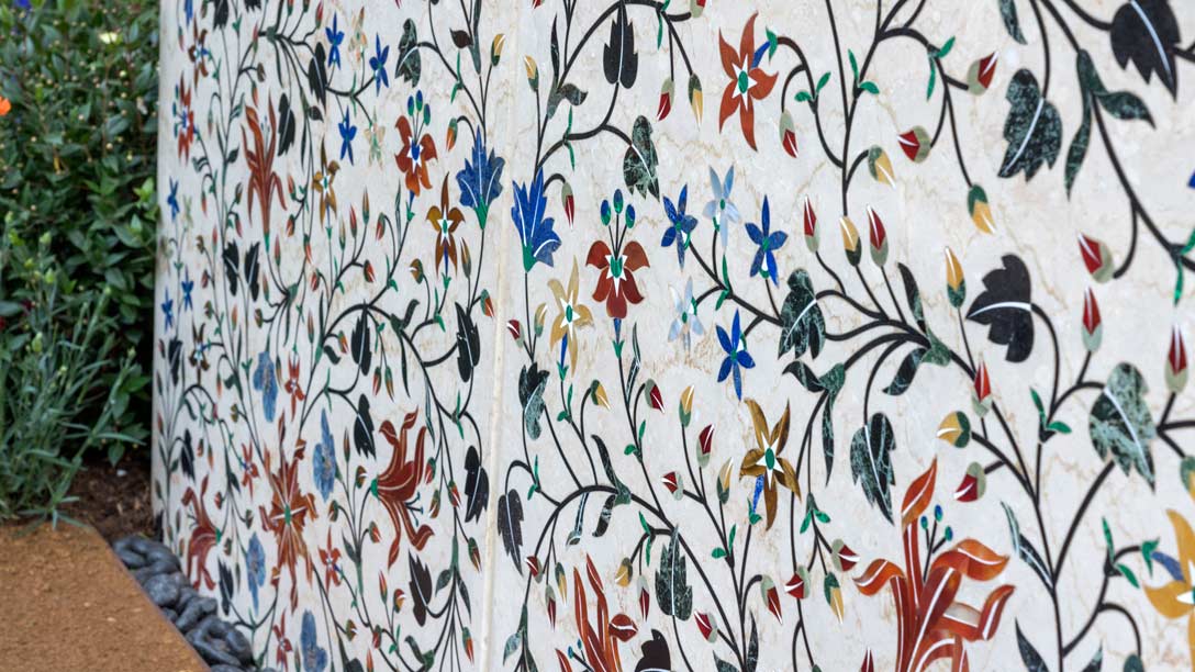 - The front walls of the garden were inset with semi-precious stones in intricate patterns. Known as pietra dura marble, this is a technique that has been used in India for centuries. Each piece of stone is cut by hand in Jaipur and set into a hollow specially cut for it to fit flush with the surface