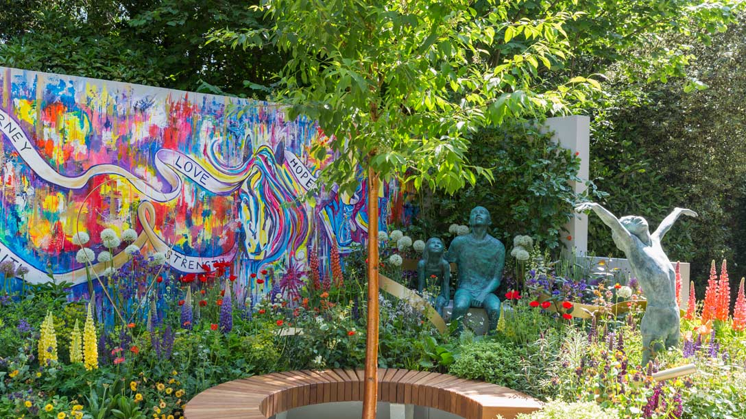 Laced with Hope told the story of a child’s journey following a diagnosis of cancer, and the work the charity Supershoes does to empower that child in their fight. The use of art to frame the garden represented the way the charity uses art on shoes to inspire sick children. Sculptures were included in the garden to represent children and their families. The lace sculpture extended up, over and through the plants, binding all elements together, with the bench providing a place for friends and support staff to sit and reflect.