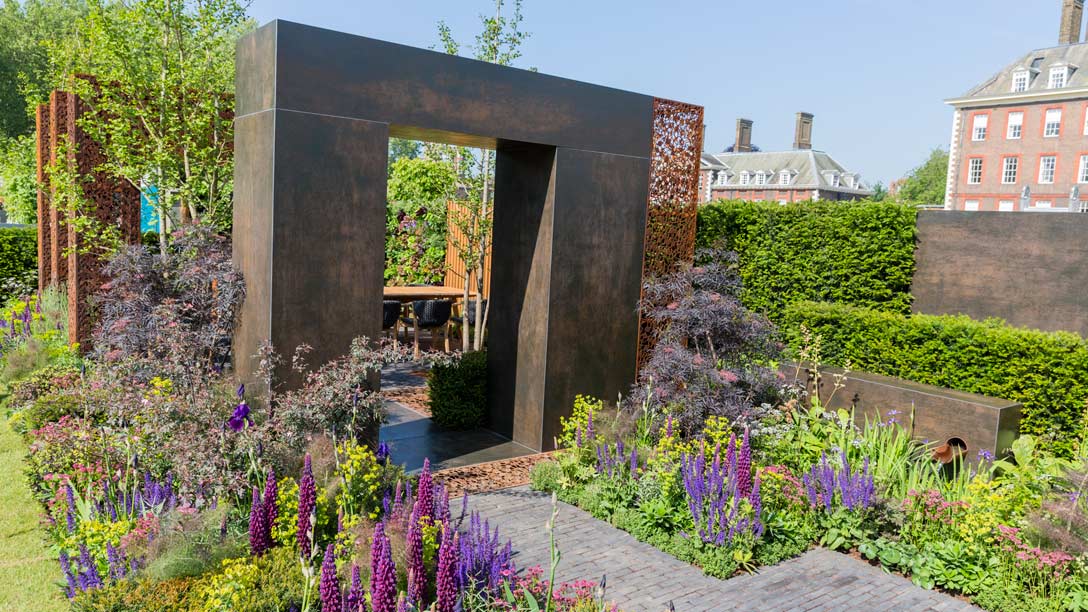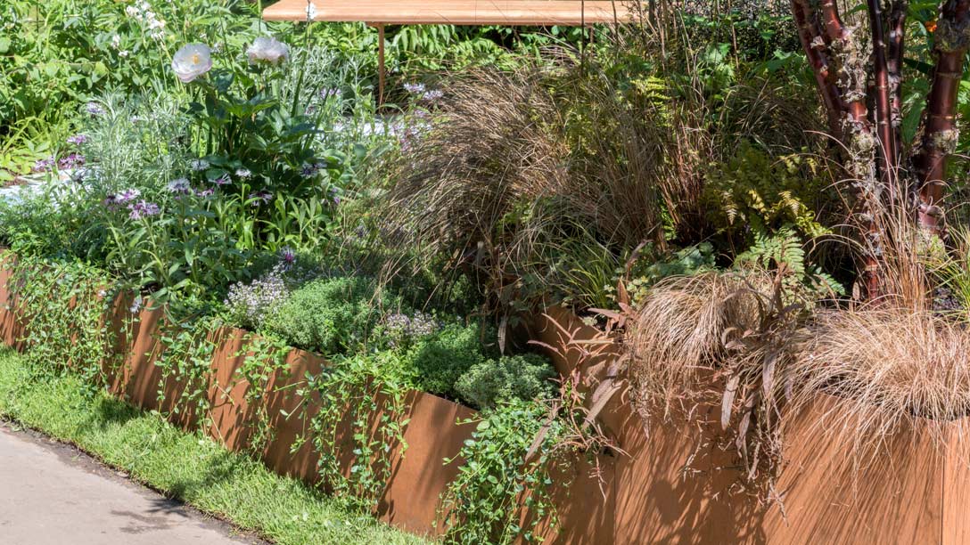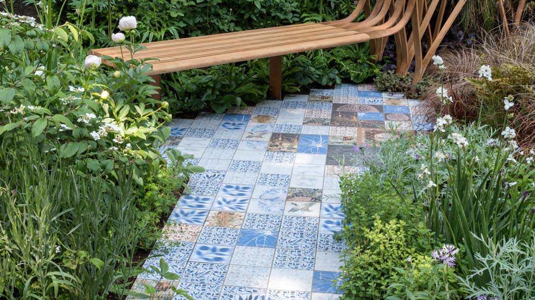 Embroidered Minds is a collaboration between writers, artists, doctors and historians to explore the effects of epilepsy, a neurological disorder that affected the eldest daughter of Victorian craftsman William Morris, and to raise awareness of how it remains a challenge today.The garden represents different states of a seizure. The pre-seizure area is calm and sedate with mainly green and white planting, including Acanthus mollis, used so often in Morris designs, and Valeriana officinalis, which was one of the first epilepsy drugs. An oak bench, tiled path and foreground garden are interrupted by dramatic, harsh, brown planting, representing a seizure. The planting beyond is more vivid with bright yellows and oranges, blue aquilegia and white peonies, associated with the possible heightening of the senses post seizure.