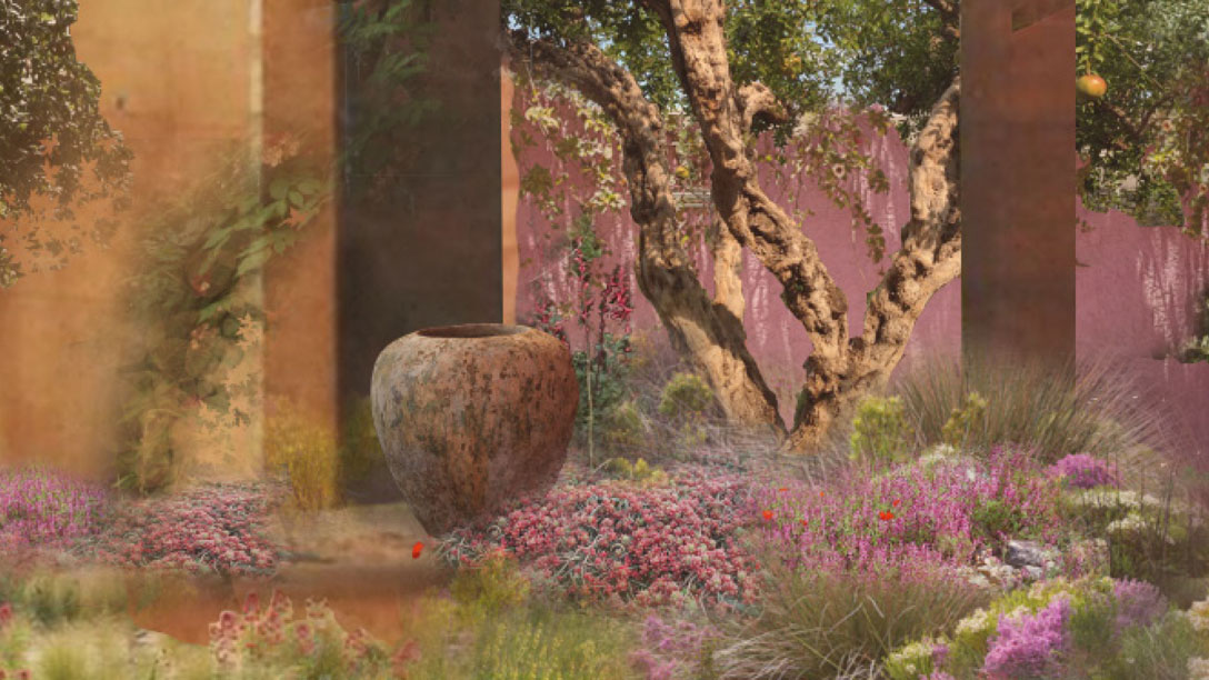 The M&G Garden was designed as a romanticised haven for a warm, sunny climate. It expanded on a timeless idea that a wall, a tree and a seat can create an intimate and beautiful place of repose. Using Mediterranean flora and raw materials dug directly out of the earth (clay, aggregate and pigment), the space celebrated the expressive language of colour, texture, light and shadow.The design was a garden of contrasts. Colour was subtle, but unexpected and dazzling. Semi-opaque glazed tiles brought out the silvery tones of subshrubs, while a clashing cacophony of scarlet, pink, lilac and yellow flowers were held together by grassy swathes. At the heart of the space, pomegranate trees commanded attention, and the glassy surface of a large pool reflected the garden’s composition. Planting included tapestries of ground-hugging, scented herbs punctuated with subshrubs and taller, wispy, diaphanous flowers. Many drought-tolerant plants were also included, which are perfectly suited to our warming climate.