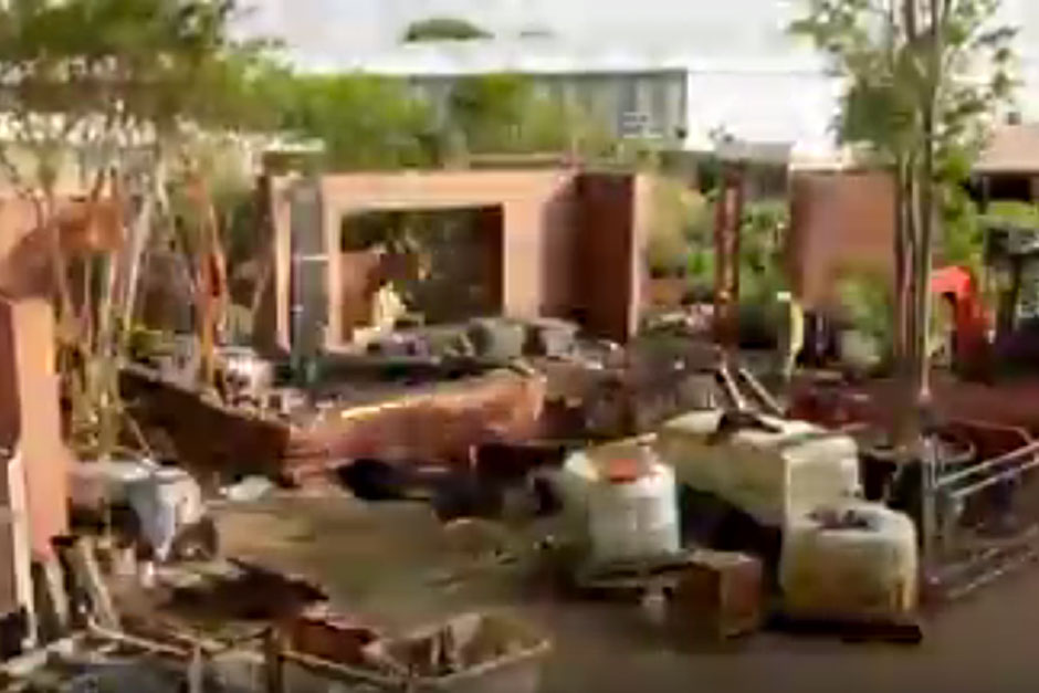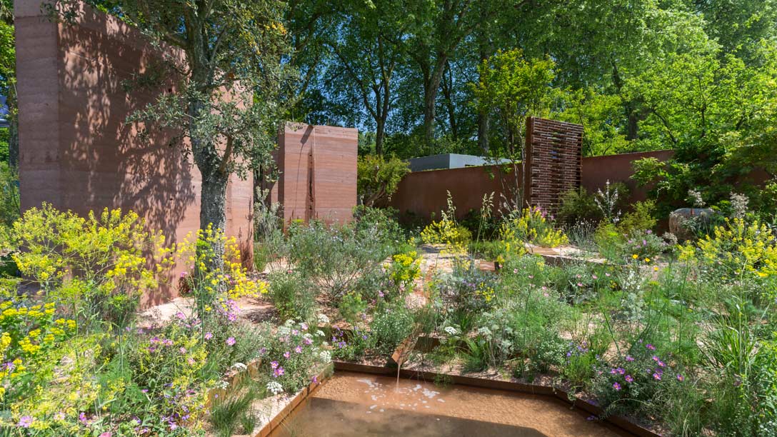 - The beautiful terracotta-toned walls in the garden were made of rammed earth and blended perfectly with the rest of the design. Some of the walls incorporated trickling streams of water that ran into a trio of angular pools, which provided a cool feel through the otherwise arid landscape