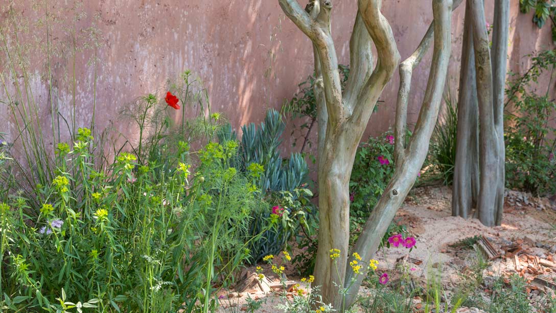 - The stand-out plants in the garden were a pair of beautifully gnarled old pomegranate trees. Their spreading forms contrasted with the more upright shape of crepe myrtle (Lagerstroemia indica), grown for their attractive bark and showy late summer flowers. A young cork oak, another common tree of the Mediterranean, also stood in the garden