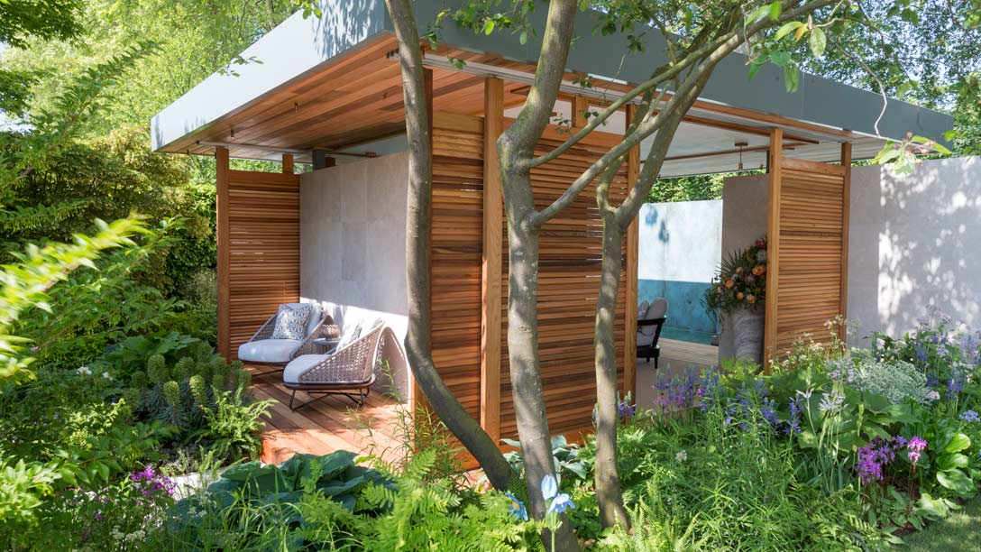 • The rear of the garden has a different feel, with a calm and reflective water 'canal' bordering the side of the cedar wood pavilion