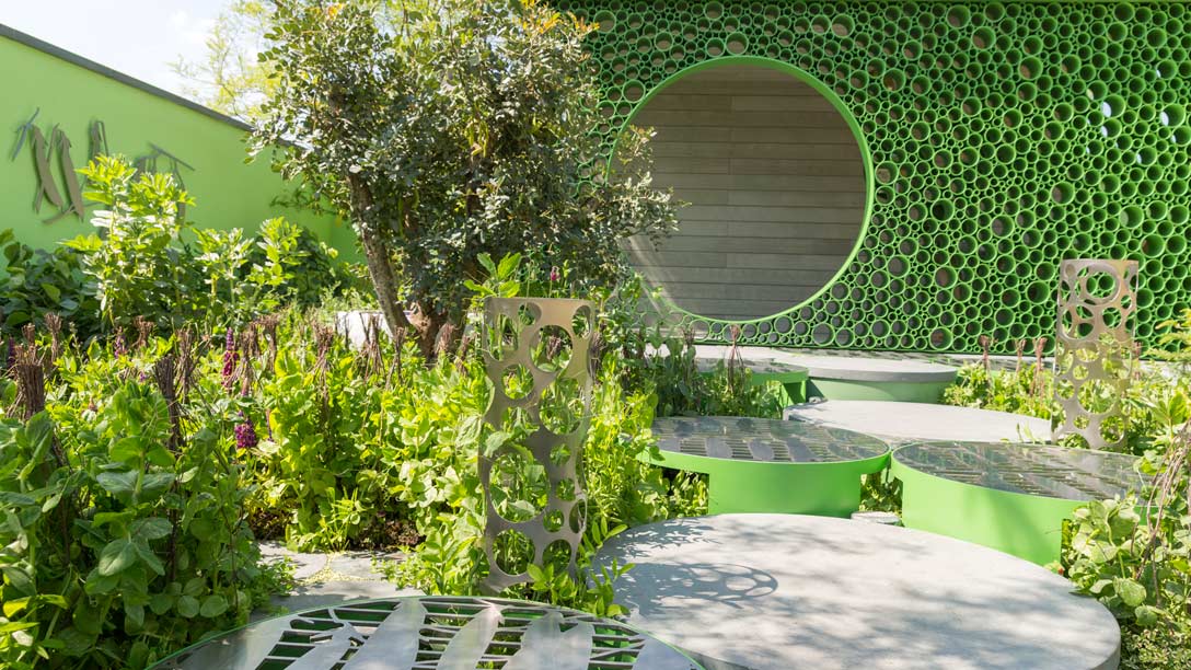 The Seedlip Garden celebrates the humble garden pea, Pisum sativum, and three men (Mendel, Lamborn and Branson), from three different centuries, responsible for pioneering its cultural, culinary and scientific significance.The planting, forms, colours and multi-sensory elements within this conceptual installation are all relevant to the pea, producing a contemporary and educational compendium in praise of one of the nation’s favourite vegetables. A garden path, formed of circular elements, representing the form of the pea, leads to the elevated Peavilion, a ‘shrine’ housing a collection of articles relevant to the pea. All species of plant used in the garden are from the pea family Fabaceae. Peas & Love!