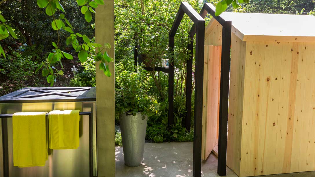 The sauna and plunge pool form the core of the garden, with rugged natural slate and smooth timbers offering a juxtaposition of form and sensation. These, and the use of floating decks, offer clever and realistic solutions for small gardens where space is limited.