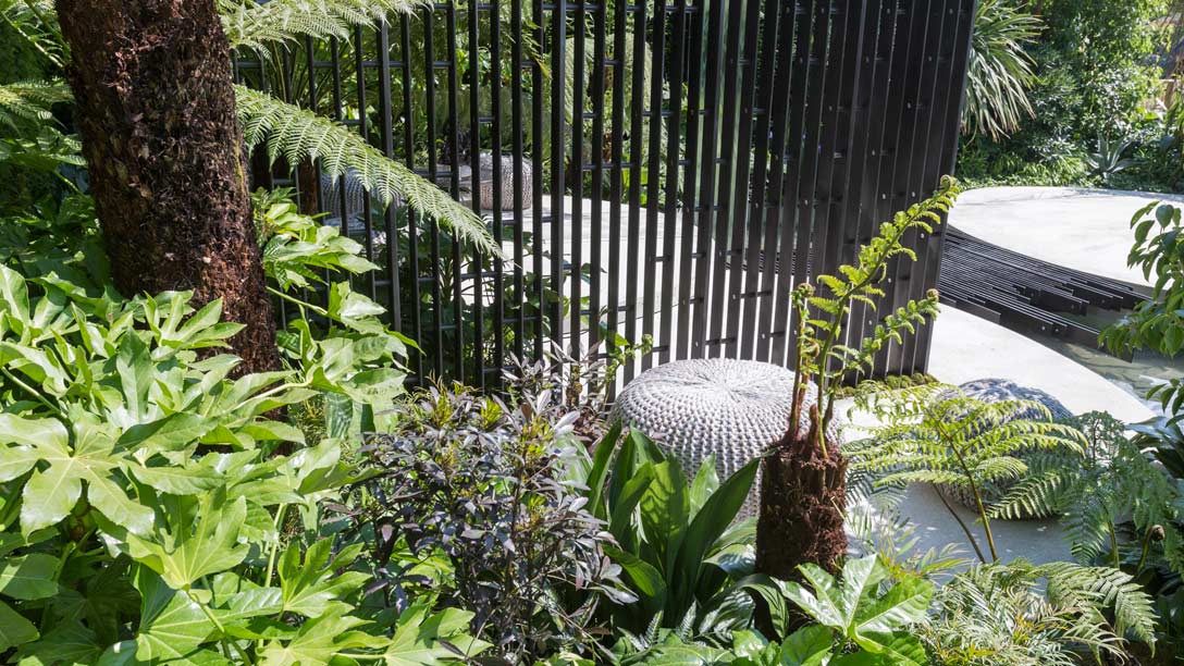 • A range of diverse foliage plants creates a great sense of interest, including palms, Dicksonia tree ferns, laurel-family Cinnamomum shrubs and ground-dwelling aspidistras
