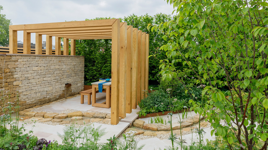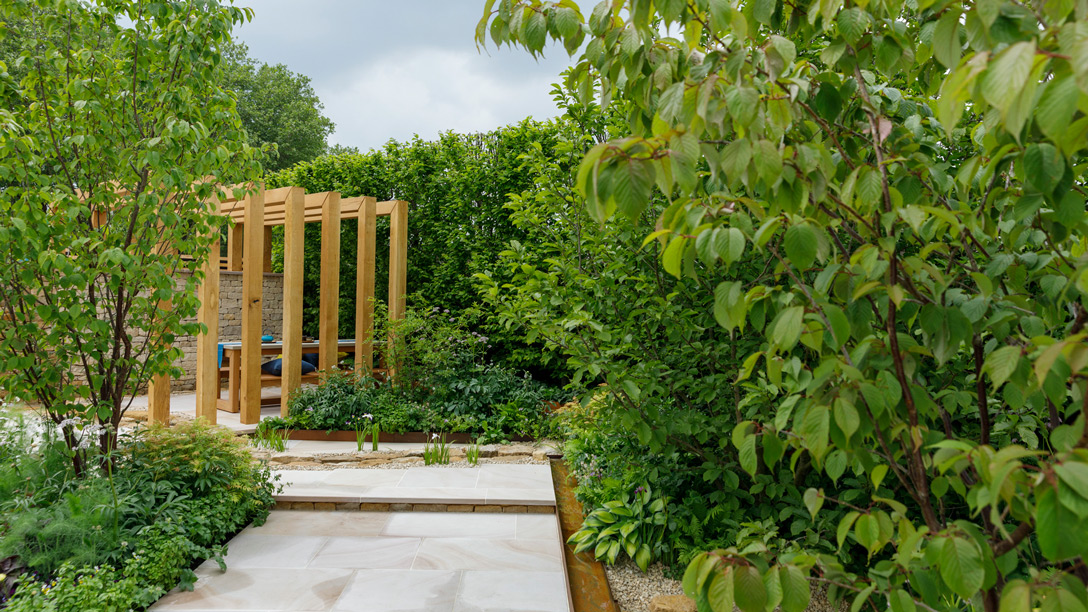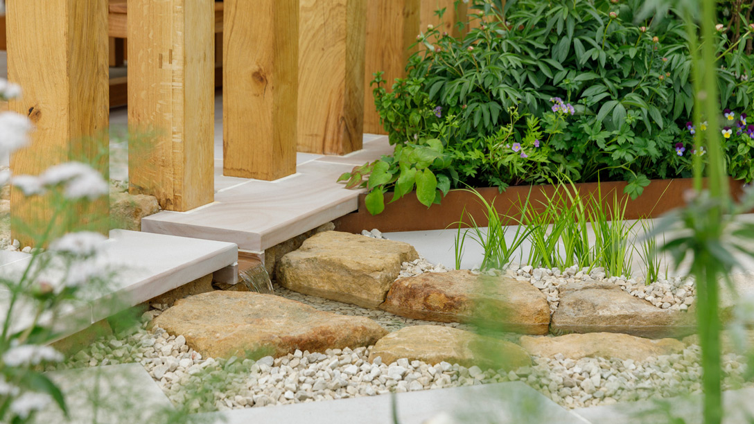 The garden is inspired by the geology of Hokkaido, the most northerly prefecture of Japan and home to the designers. During the long winters, the landscape is dominated by snow-capped mountains, and it is the joyful sound of melting ice that has inspired the design for the rill and pool. A wooden pergola and stone patio provide a space from which to view the landscape.